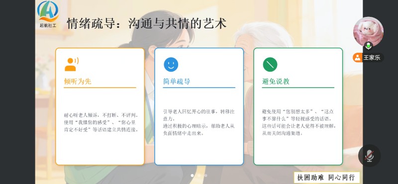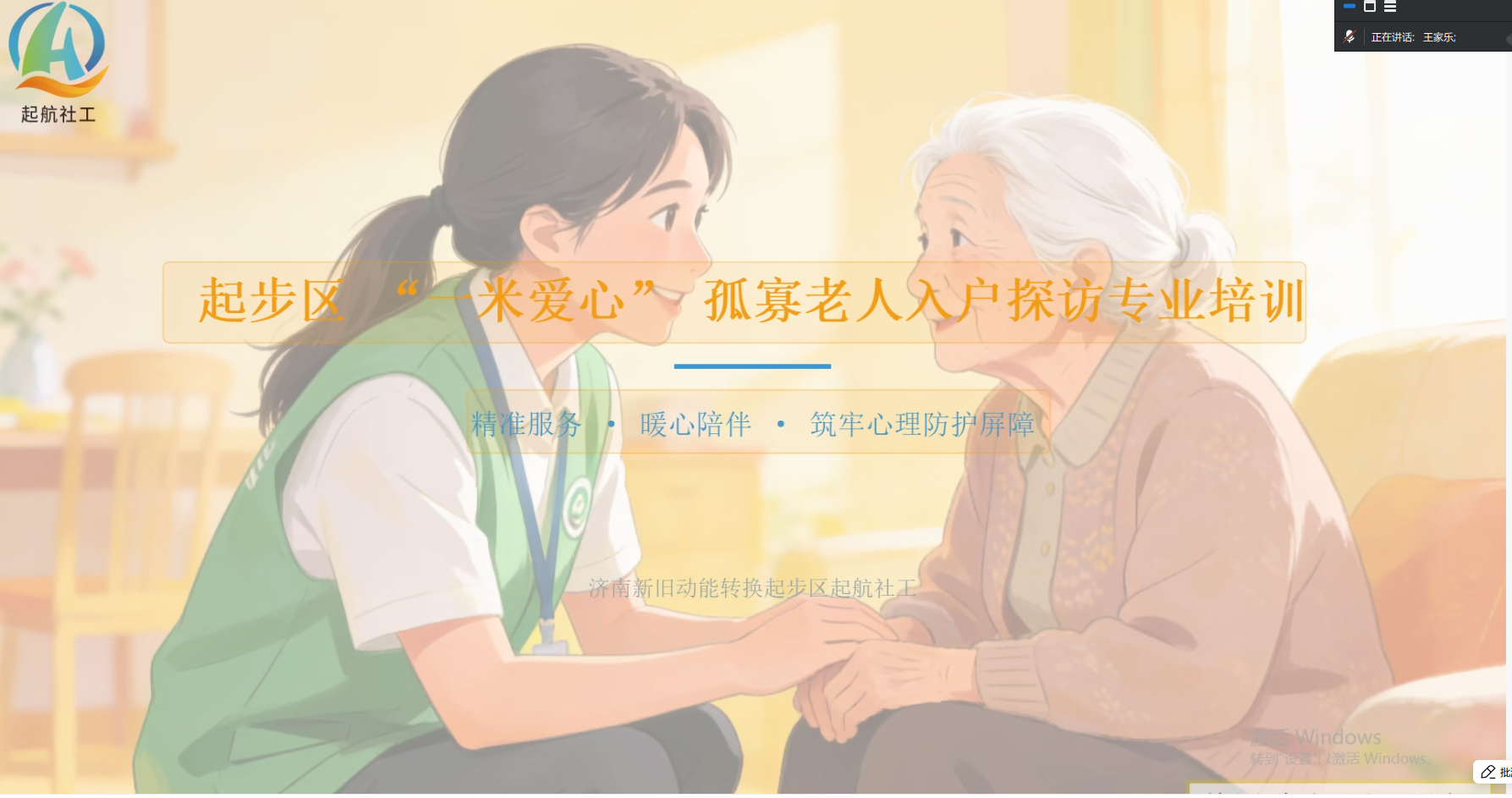 培训会上,总站社工围绕项目背景、前期准备、探访流程、服务技巧、档案管理、风险干预、注意事项、答疑解惑等内容,通过PPT演示讲解、案例解析、探讨交流等方式,让参训社工系统掌握与孤寡老人沟通的技巧、心理状态评估方法以及常见心理问题的应对策略。此次培训,不仅提高了社工的专业服务能力,更为后续项目的顺利开展奠定了坚实基础,确保每一位参与项目的孤寡老人都能得到专业、贴心的心理关爱服务。