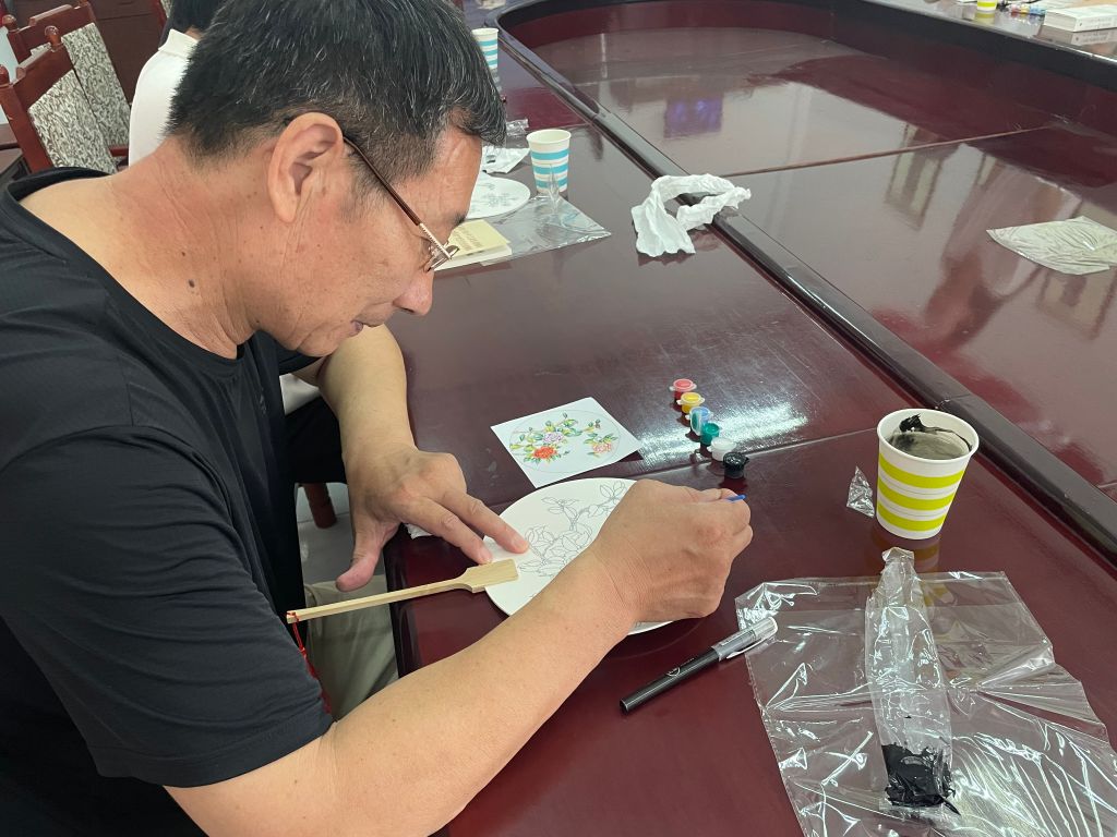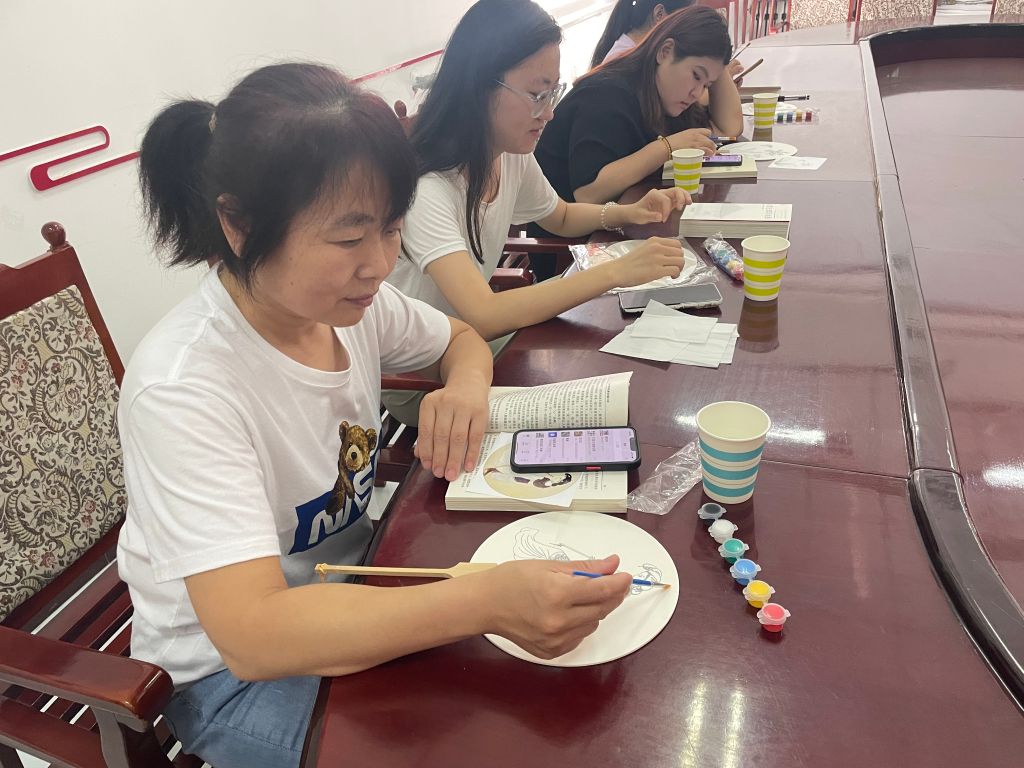 活动开始,社工组织在场的居民进行“击鼓传花”游戏,在欢快的音乐中快速传递手中的花团,音乐声停,手拿花团的人分享第一次读书会,印象深刻的文章或者诗句。居民王老师分享读过的一首词《沁园春 雪》,通过充满感情地阅读,将革命英雄的伟大精神深深印在了在场所有人的心中。此次环节拉近了组员们彼此之间的距离,让组员们能够放松心情融入小组。分享结束后,大家就新挑选的书籍阅读起来,阅读过后,居民李老师主动分享感悟,同时号召居民从自身做起,减少电子产品使用频率,真正感受阅读,充分享受阅读的快乐,并积极带动家人及朋友参与阅读活动,自觉养成良好的阅读习惯。阅读结束后,大家一起制作手工团扇,先是挑选自己喜欢的扇面,根据扇面把自己读书过程中印象深刻的句子写在扇面上,文字与扇子的碰撞,让大家把对书籍的理解用扇子的形式表现了出来,变得更加形象和具体。制作完成后,大家纷纷拍照留念。此次活动,激发居民的阅读热情,营造了浓厚的读书氛围,增进小组成员之间的沟通和情感交流,提高了成员的鉴赏能力。