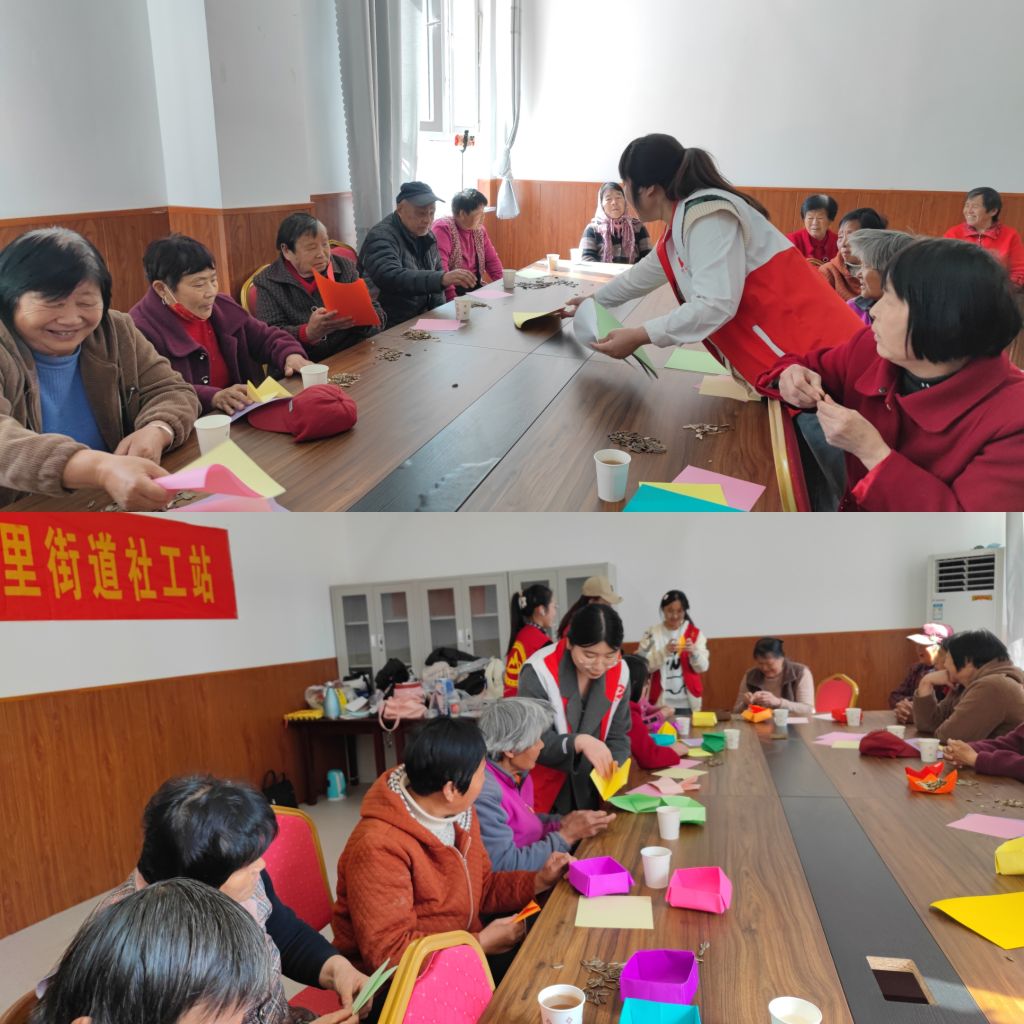 活动一开始,社工和志愿者们便与老人们围坐在一起,开始了有趣的折纸教学。一张张彩纸在手中翻飞,不一会儿,栩栩如生的小船、花篮便跃然眼前。老人们虽然动作稍慢,但在志愿者们的耐心指导下,每个人都完成了自己的作品。看着手中的折纸,老人们脸上洋溢着满足的笑容,仿佛回到了童年的快乐时光。“这花篮真好看,我要带回去给孙子看看!”一位奶奶开心地说道。小小的折纸不仅拉近了彼此的距离,更让老人们感受到了陪伴的温暖。