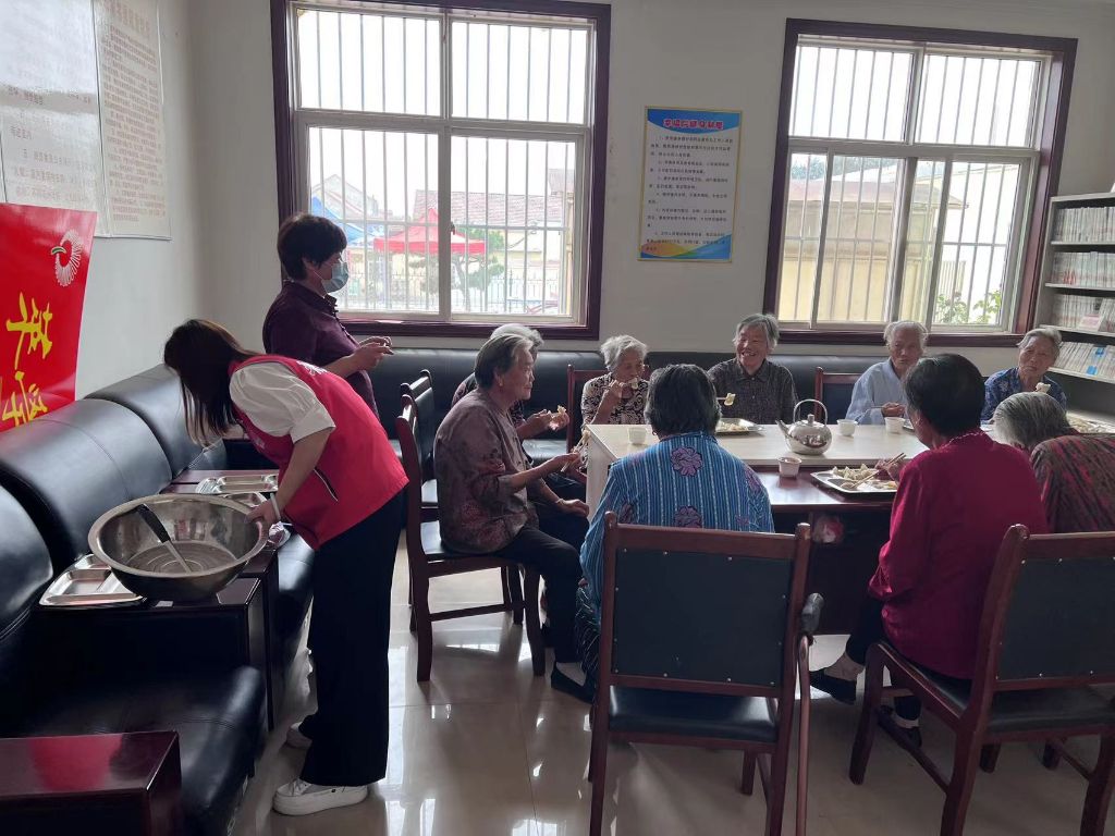 上午9时,社工们来到东街村幸福院,和志愿者们迅速分工完毕,大家都撸起了袖子,有人揉面,有人擀饺子皮,有人包饺子……幸福院里顿时变得热闹起来,餐厅里充满了欢声笑语。在大家紧张忙碌下,一个个白白胖胖、芳香四溢、满载爱心的饺子呈现在大家面前。社工接待着一名名接踵而至的老年人,端茶倒水,时而聊的热火朝天,时而又高歌声起,快乐的氛围也传染着每一名社工用心服务着老年人;水饺熟了,老年人端坐在餐桌前等待着社工的分发,品尝着美味的饺子,露出了幸福的微笑。