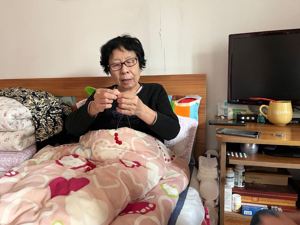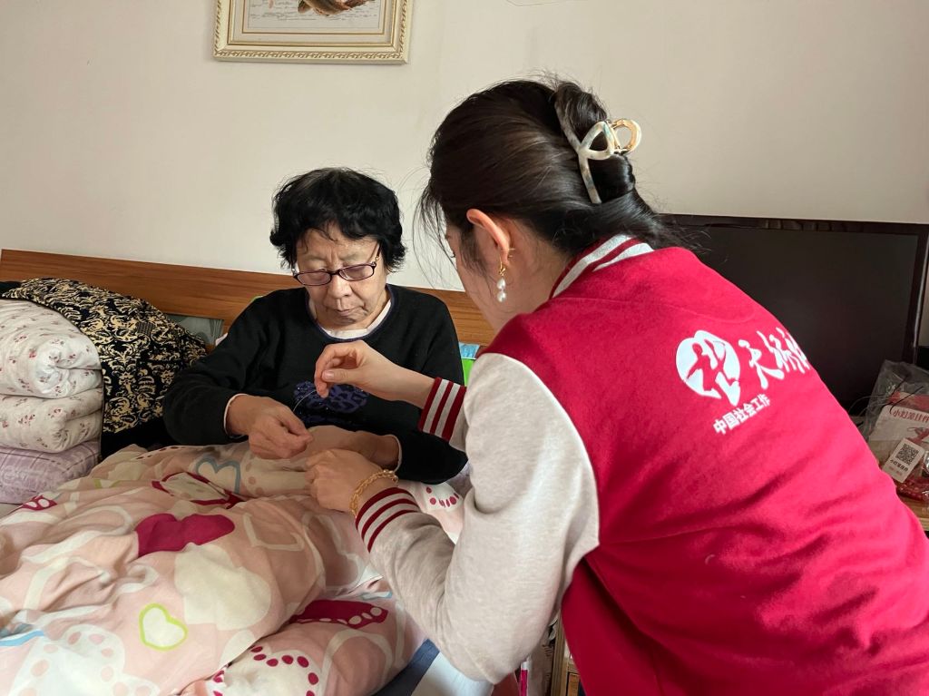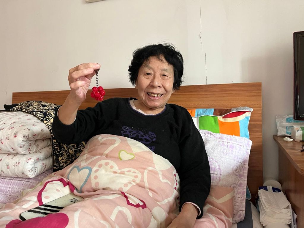 “右边穿四珠,回传打结 ,然后继续右边穿三珠”“对对很好,黄阿姨,形状已经出来”,卧床两个月的服务对象黄阿姨,今天在社工的引导下自己动手制作了一个串珠钥匙扣,从串珠到打结全是服务对象黄阿姨自己做的,社工一直在旁边鼓励,没一会儿功夫小巧精致的钥匙扣就做好了,看着自己的作品黄阿姨别提多开心了。