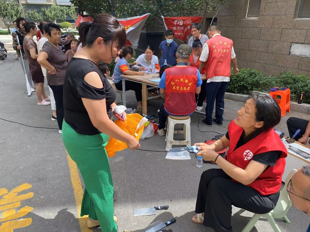 活动刚开始,参与居民就络绎不绝,大家立即投入到紧张有序的工作中。社工和志愿者搭配合作,登记、贴标签、开刃、磨剪子、戗菜刀“一条龙服务”。