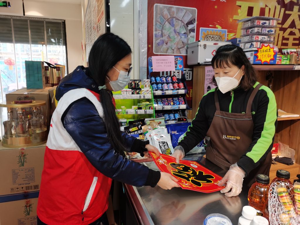 文昌街道社工站社工对辖区内商户进行走访,将印有文昌街道社工站二维码的福字送到商户手中,并提前送上新春的祝福,本次共走访商户400余户,发放福字近千张。商户们感谢站点社工们的祝福,他们还表示,整条街的红色“福”字为商户临街增添了几分美好的节日气氛,祝愿大家新春佳节快乐。