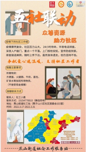 近期疫情形势严峻,加之即将开展全员核酸健康筛查,社区工作者工作强度不断加大,社区人手严重不足。为更好支持社区工作者,助力疫情防控,燕山街道社工站特发起资源众筹和志愿者招募活动,希望通过链接多方资源,发挥五社联动机制,形成坚强合力,助力社区疫情防控工作。