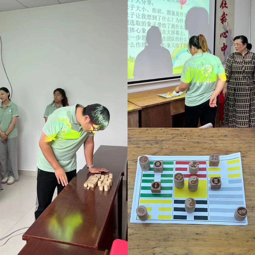 随后刘老师借助破冰环节中承担的不同角色,现场提问社工们破冰活动中对于压力的感受以及对压力的评估。同时为社工们介绍了几种调整压力感受的方法,让社工学会拓展自己的心理空间。最后刘老师通过借助心理工具——量子心象棋,分析解读了社工们的压力情况。让社工们敞开心扉,放松身心,畅所欲言,解释了自己棋子的位置,观察的含义,并进一步思考集体心象带给自己的启发。