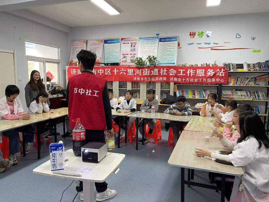 为了丰富流动儿童青少年的课外生活,激发孩子们对科学学习的兴趣,帮助他们建立积极的学习态度。十六里河街道社工站联合积成社区活动中心于11月9日,开展了流动儿童化学兴趣小组“实验坊:化学的魔法之手”的第四节课——“可乐牛奶实验”。