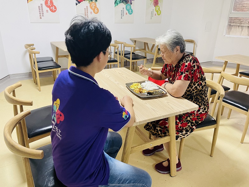 每到中午开餐时间,老人们便会陆续前来就餐,张庄路街道综合养老服务中心立马热闹了起来。张庄路街道社工站社工不仅会帮助老人打饭端菜,也会坐下来与老人进行亲切交流,询问老人的近期生活状况,或询问老人们还有什么其他需求。在建立良好的沟通关系的同时也让老人们感受到社工的关爱。
