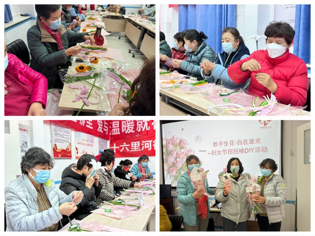 为丰富辖区女同胞的业余文化生活, 促进社区居民之间的情感和交流,提高女性居民的凝聚力和幸福指数。3月8日上午,十六里河街道社工站联合南苑社区共同开展“妙手生花·自在逐光”妇女节扭扭棒DIY活动。