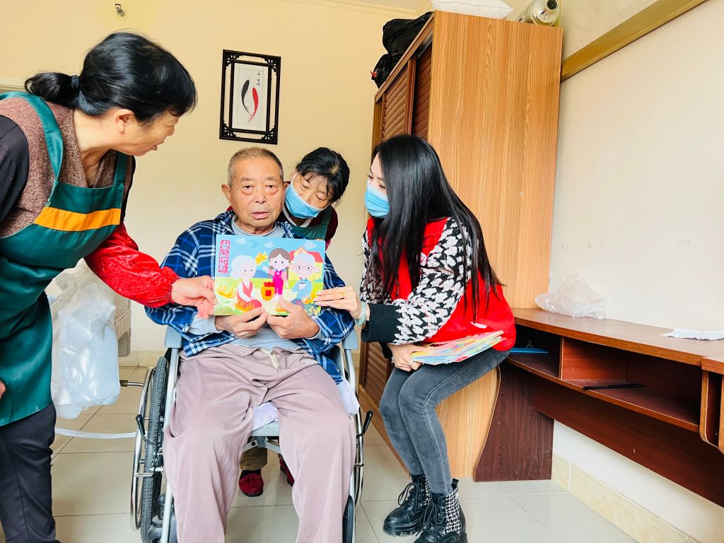 活动伊始,社工站为老人送去慰问品及节日的祝福,社工详细询问老人的身体状况、日常起居、生活需求等情况。手指操环节是老人们最喜欢的,跟着熟悉的旋律一起拍手表演,热闹的氛围带来阵阵欢声笑语。与此同时,社工将港沟中心幼儿园小朋友制作的重阳节贺卡送给老人,并将孩子们的祝福一同送到,拿到卡片的老人开心的说“这是他们收到的最好的礼物”,所有老人都沉浸在温馨的节日氛围里。