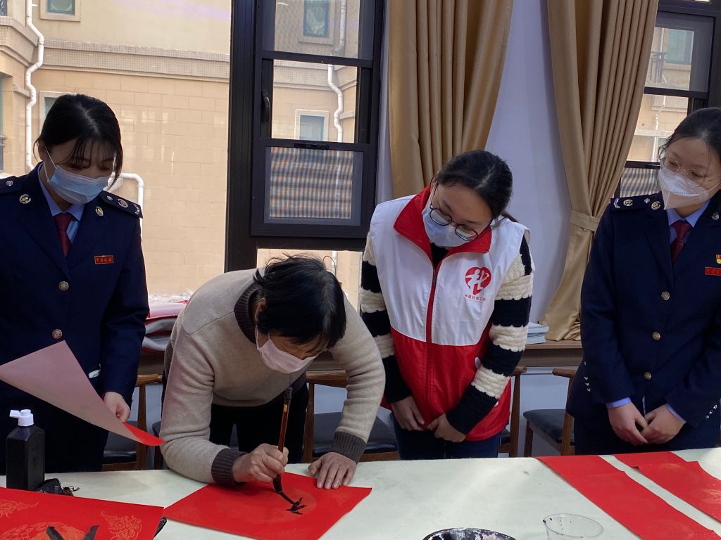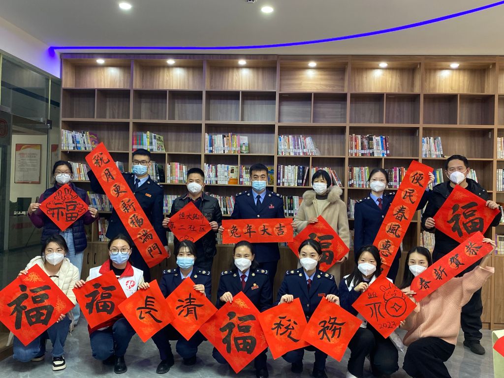在兔年春节即将到来之际,为弘扬中华传统文化,让居民充分感受节日温暖,营造喜庆热烈、文明祥和的节日氛围,进一步拉近居民之间的距离,提高居民的获得感、幸福感。1月5日,文昌街道社工站联同长清区税务局、恒大绿洲第二社区居委会开展“卯兔迎新 书韵呈祥”主题书法活动。活动邀请了社区书法爱好者写春联、绘“福字”、送祝福、送“福”到家。