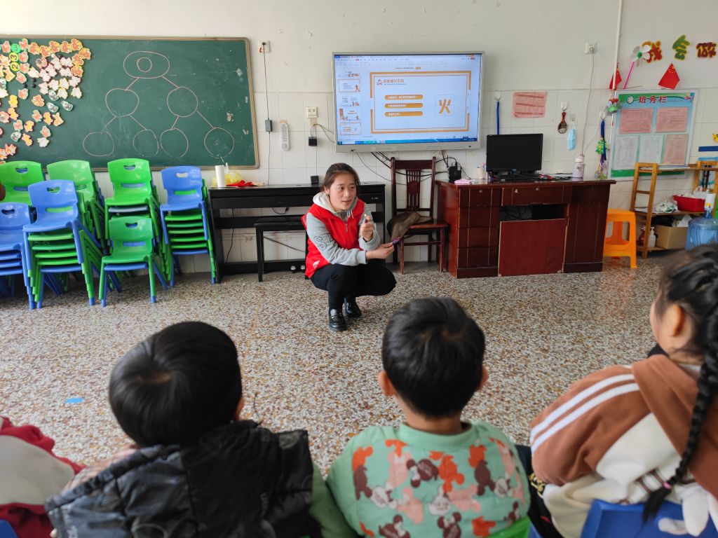 活动伊始,社工与儿童一同回顾第一节、第二节小组活动内容,儿童做出积极回应。其次,本节小组活动围绕“火”展开讲解,志愿者以火灾危害为切口,通过游戏互动、趣味问答等环节,给儿童科普校园防火常识、灭火常识、火场逃生常识、安全提示标志识别等知识,并强调火灾的破坏性,提醒儿童不玩打火机、火柴、不燃放烟花爆竹等危险物品。社工还带领儿童诵读报警歌谣、火场口诀,提高儿童消防安全意识及自救防范意识,引导儿童主动思考面对不同紧急火情时应该怎么做到自救与互救。