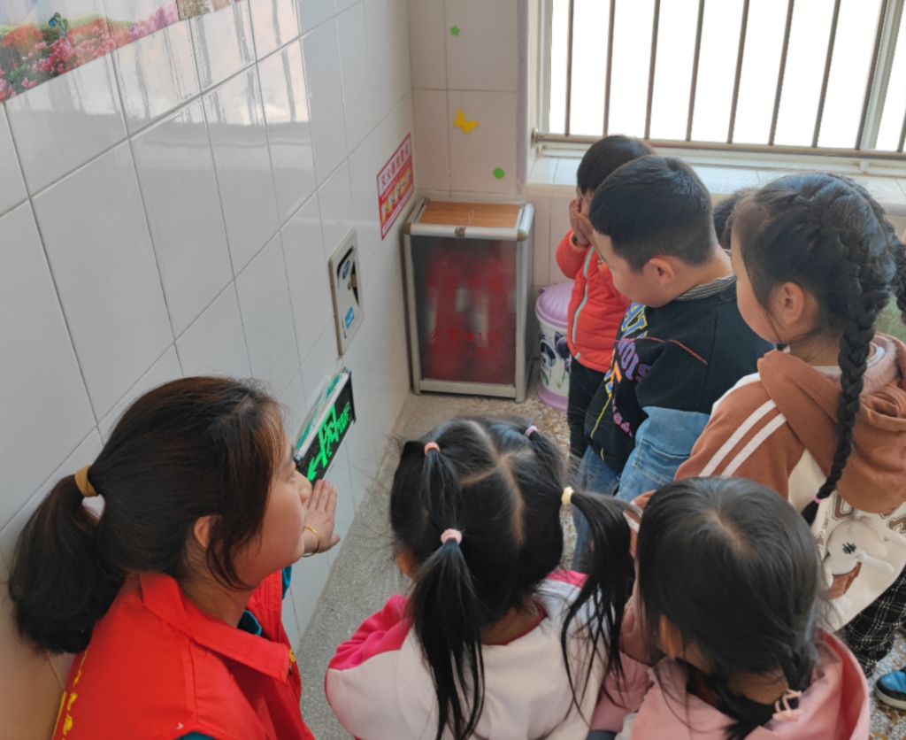 现场进行模拟逃生演练,让儿童牢牢记住,发现着火时附近有大人先通知大人或者拨打119报警;着火时火势较小时可以用水浇灭;火势较大无法浇灭应第一时间用浇湿的毛巾或衣服捂住口鼻,从火势较小的通道有序逃生。