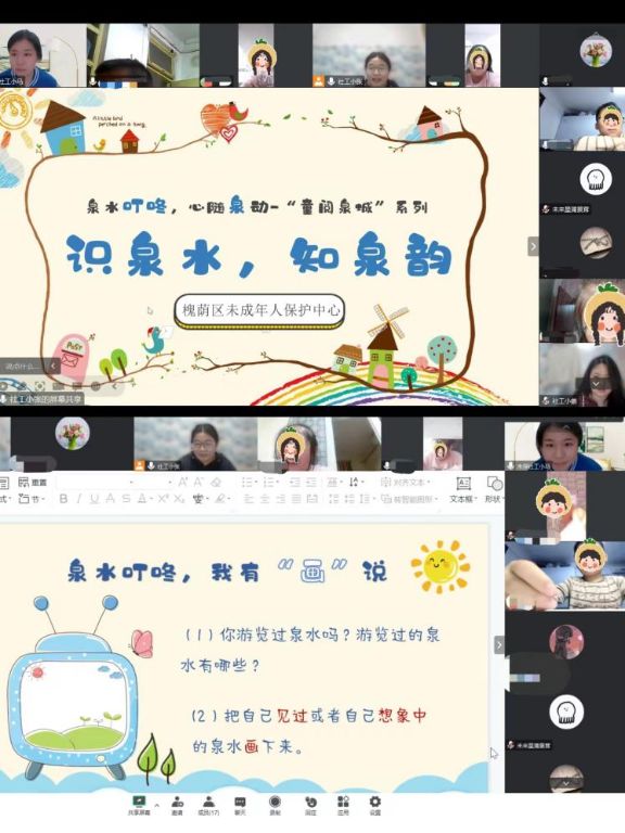 首先,为让儿童初步认识泉水,激发儿童对于泉水的兴趣与探索欲,社工采取线上科普的方式,以泉水的形成与特点为引入,帮助儿童理解济南的泉水的形成过程,并与儿童一起阅读泉水故事、了解泉水的年龄......最后引导儿童画出自己心目中的泉水,为外出探索活动做好了铺垫。