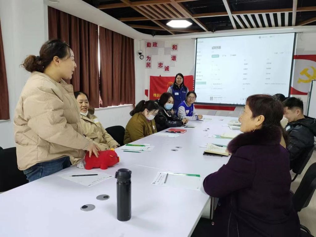 社工站社工通过“击鼓传花”游戏与在场的骨干建立关系,通过问答方式解释了社会工作的服务内容,说明社工站和社区居民的关系,对社区社会组织的定义、概念和功能做了讲解。社区工作者和网格员从社区党建、网格化管理、志愿服务等方面进行了分享与交流。