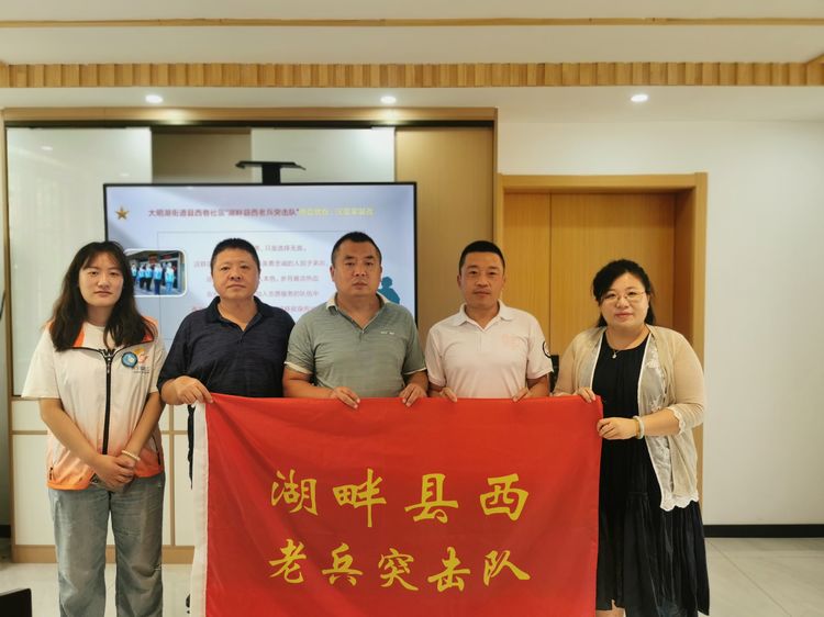 首先大明湖街道县西巷社区书记郭亚楠和大明湖社工站站长为“湖畔县西老兵突击队”授发队旗并合影留念。