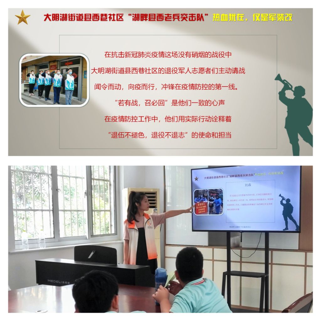 随后大明湖社工站社工孙佳琪为小朋友们介绍了身边的榜样——湖畔县西老兵突击队的服务事迹。
