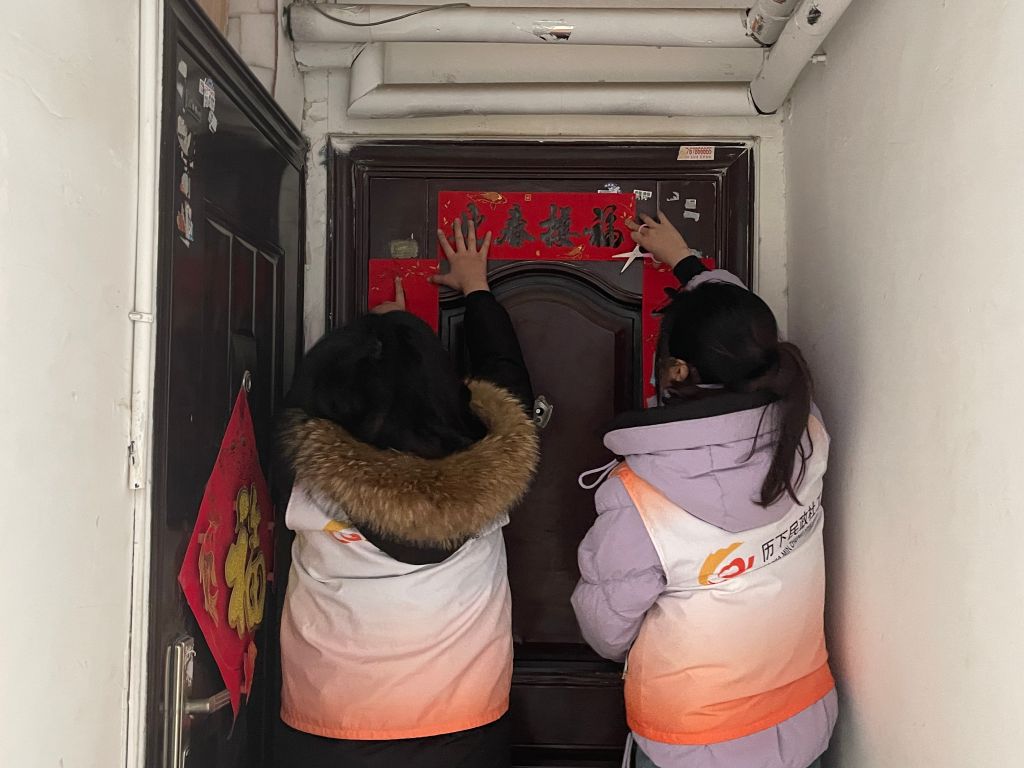 腊月二十八,贴花花把面发。前期,大明湖街道社工站联合街道退役军人志愿服务队、春晖星儿家长支持中心为以老养残民政救助对象困难家庭L家提供卫生清洁志愿服务时,社工站社工与L商定,年前一起贴上春联。2月7日正逢腊月二十八,在春节来临之际,大明湖街道社工站社工敲响L老师家门,贴上了寓意吉祥、幸福的对联,使其感受浓浓的年味和喜庆气氛。