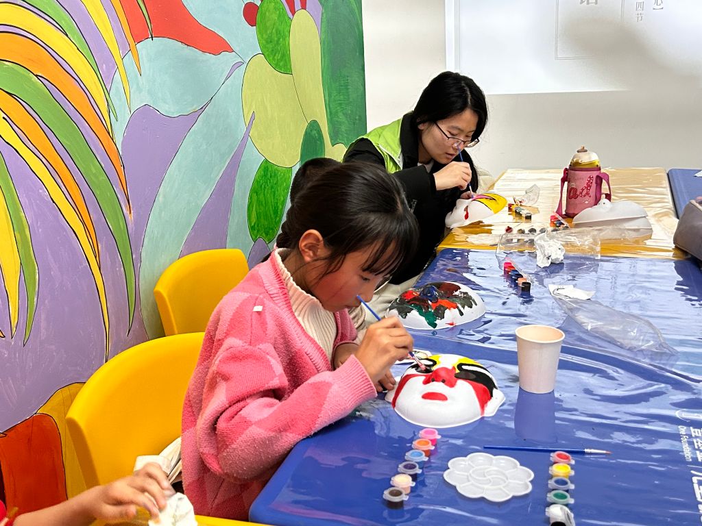 在彩绘脸谱环节中,脸谱是京剧表演中不可或缺的元素,每一幅脸谱都代表着不同的角色性格和命运。在社工的指导和示范下,孩子们开始动手绘制脸谱,他们有的参考了脸谱的常见图案,有的根据自己的想象力和喜好创作出独特的脸谱。首先孩子们细心描绘,使用黑色颜料笔在面具上勾勒出脸谱的轮廓,然后使用各种颜料为脸谱的各个部分填充颜色,最后孩子们还对脸谱进行了细节修饰,如添加图案、花纹等,让脸谱更具个性和创意。手中的画笔在脸谱上流转,仿佛在勾勒出千变万化的角色性格。