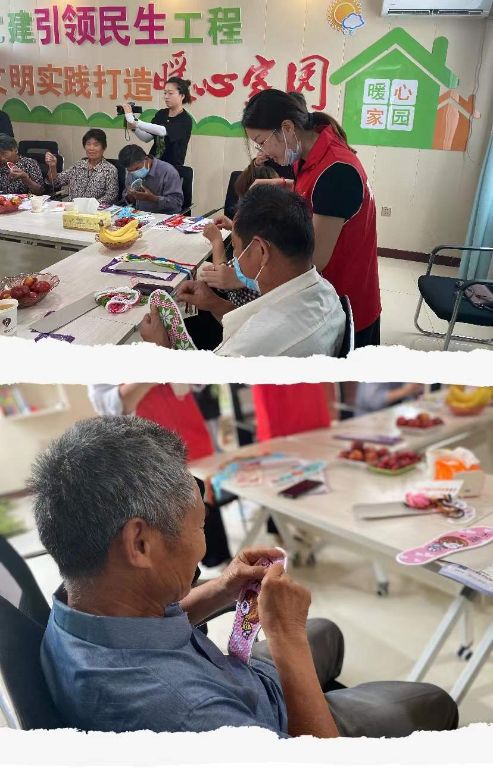活动开始前,工作人员为特扶人员讲解今天的活动流程并与他们拉家常,嘘寒问暖,对他们进行心理疏导。“第一针从下往上,第二针找到对角的点往上往下……”社区志愿者制作鞋垫达人张阿姨仔细说明制作鞋垫的步骤,。她一方面耐心细致地为大家科普手工编织的具体细节和技巧,另一方面,手把手细心指导。辖区内特服失独家庭20人学习着制作鞋垫方法,在一针一线之间凝聚巾帼魅力。