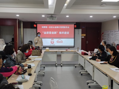 让居民参与公益银行管理的方式,提高居民对公益银行的了解,一支由社区文体队伍代表、党员和居民代表组成的益居营造团成立了,作为志愿者与居民的“枢纽”团队,他们从志愿者宣传招募、志愿服务对接、积分登记、积分兑换等方面分部门、分职能进行公益银行的管理。