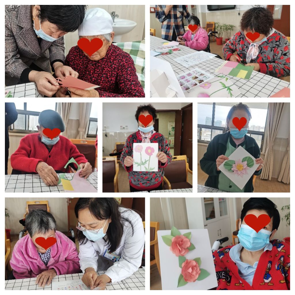 为了让老人和患者更多感受到春天的气息,本次小组活动以手工剪纸拼贴花卉为主题。社工首先带领大家辨识不同颜色、形状和特点的花卉,然后指导大家如何用手工花卉制作材料进行剪裁、折叠和粘贴,并和护士一起在制作的过程中充当康复患者和老人的小助手,协助他们完成手工。最后,每位组员都顺利完成了手工花卉作品,欣喜得给大家一一展示,并在活动结束后高兴地拿回房间摆放。