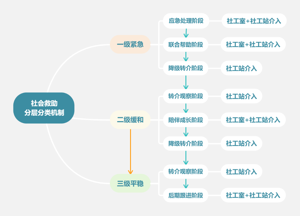 在前期走访调研、摸排建档的基础上,社工站和社工室根据救助对象所在时期、所处情况和所需服务的不同,将社会救助分为三个层次:一级紧急、二级缓和和三级平稳。