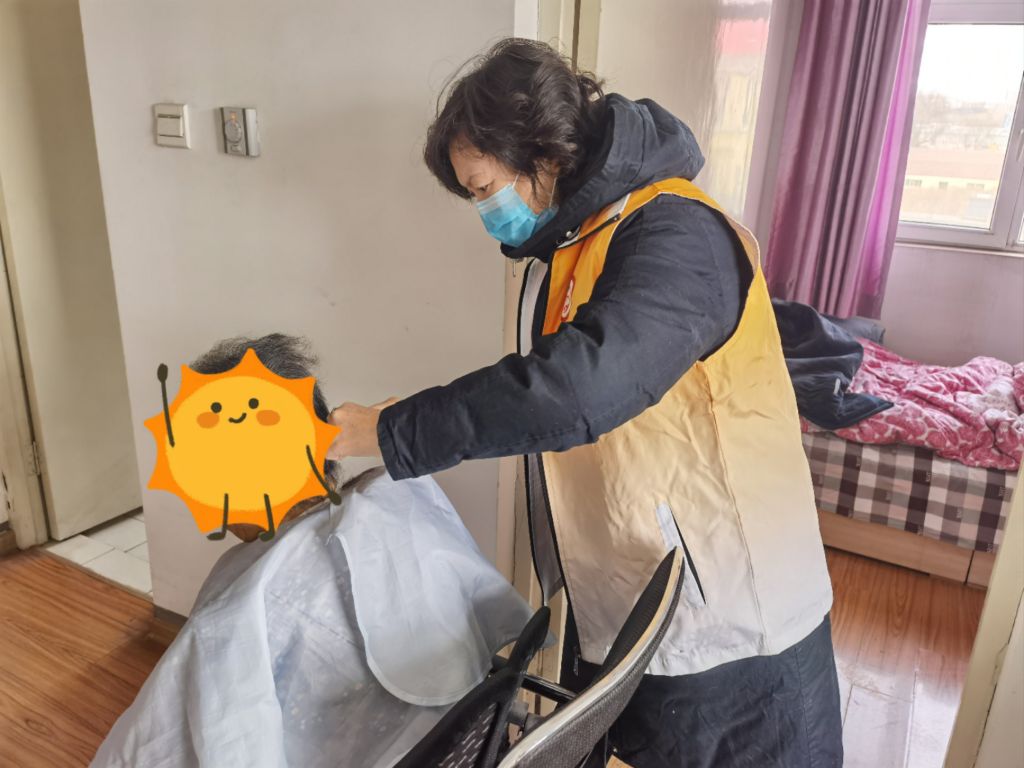 在确认服务对象身体状况允许后,家属和社工将服务对象搀扶到椅子上,一把剪刀、一把梳子、一块围布就组成了一间小小的“理发室”。“阿姨,我来给您剪头发,过年了剪个精神的发型,一会儿要是不舒服及时告诉我。”志愿者拿起剪刀、推子娴熟地理起发来,随着剪刀咔嚓咔嚓响起,不一会儿,服务对象便换上了干净利落的发型。随后,志愿者从多个角度查看发型,对耳后、鬓角等细微之处进行调整,社工则细心地帮服务对象拂去掉落在身上的碎发,整理好皱褶的衣领。“咱们民政服务真是贴心,这样老人过节也干净利索,省了一大心事。”家属连声称赞社工站心系困难老年人,将服务做到了老人的心坎上。