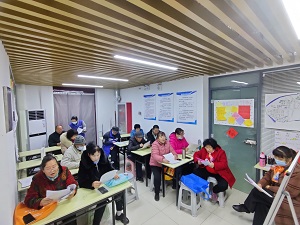 经过几轮的歌谱回顾,成员状态渐入佳境,迫不及待地想要学习新内容。“识谱”是音乐类队伍的必要技能,本团队学习部的“老师”是社区中懂得乐理知识的三名居民,经过他们的讲解配合,团队成员的音调也逐渐“步入正轨”,成员纷纷拍手称赞,现场氛围其乐融融。