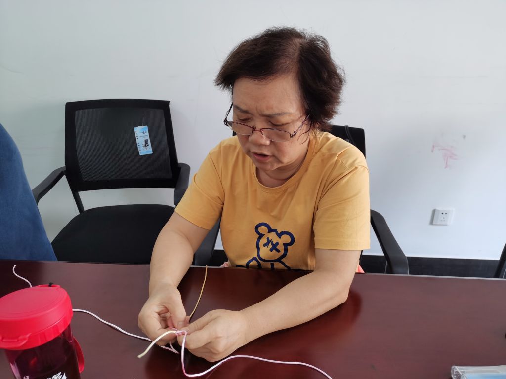 于老师首先为居民讲述了手工编绳发展历程,它始于上古,兴于唐宋,盛于明清。经过几千年的沉淀传承,从实用绳结技艺,演变成为今天我们看到的“艺术品”,呈现出中华民族智慧的结晶。手工编绳应用广泛,有传统装饰的中国结,有搭配汉服的盘扣、首饰等等,本节课老师教授三种常用编绳技法,可用做手链、项链、花边等。