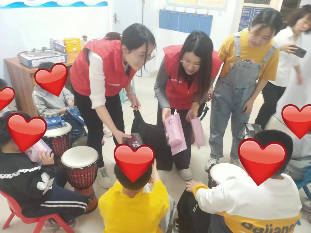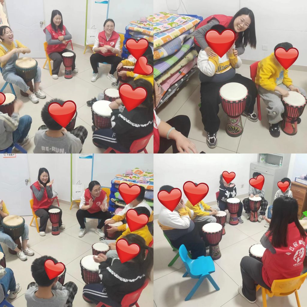 社工来到查旧社区彩虹伞特需儿童发展中心,走进教室,经过上次的接触星宝们对我们并不陌生,看到我们的到来高兴极了,有的还热情的跟我们打招呼。活动开始前,我们通过唱《小星星》来进行热身。接下来,社工讲解了本节活动的主题-击打非洲鼓,非洲鼓是一种有效的音乐治疗方式,星宝们通过击打非洲鼓,可以释放情绪,缓解不安情感,在互助和鼓励中得到成长。活动现场以打击乐器“非洲鼓”为载体,社工通过积极欢快的歌曲《小花开了》打唱形式为星宝们打造一个快乐、友爱、团结、互助的音乐课堂。社工们跟星宝们亲密互动,老师也在一旁进行指导,从星宝们的参与热情和积极的表现,不难看出他们对非洲鼓的学习兴趣浓厚。