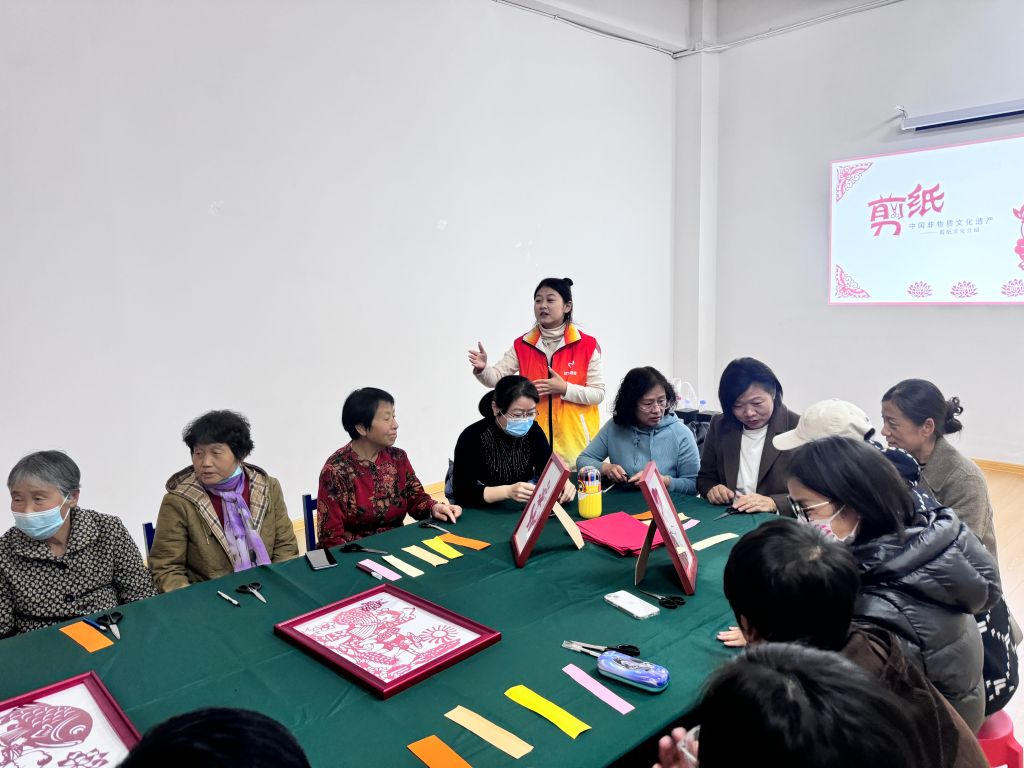 活动伊始,社工与组员们互相认识并向小组成员介绍了学习小组的内容和安排。为活跃现场气氛,志愿者带领组员们进行了“斗智斗勇抢彩条”破冰小游戏,拉近距离的同时也调动了组员们的思维,帮助组员们集中注意力,为后续剪纸活动做准备。随后,开启了“灵剪启智—剪纸教学之旅”志愿者通过准备的ppt讲解有关于剪纸艺术的起源、剪纸的基本方法、剪纸的分类与寓意等,通过展示剪纸的图片、视频等讲解剪纸的基本内容。让组员们简单认识到剪纸的文化背景,掌握一些基本操作。最后,以图片的形式向组员们介绍各种样式的剪纸作品,让组员们感受到剪纸传统文化的独特韵味。